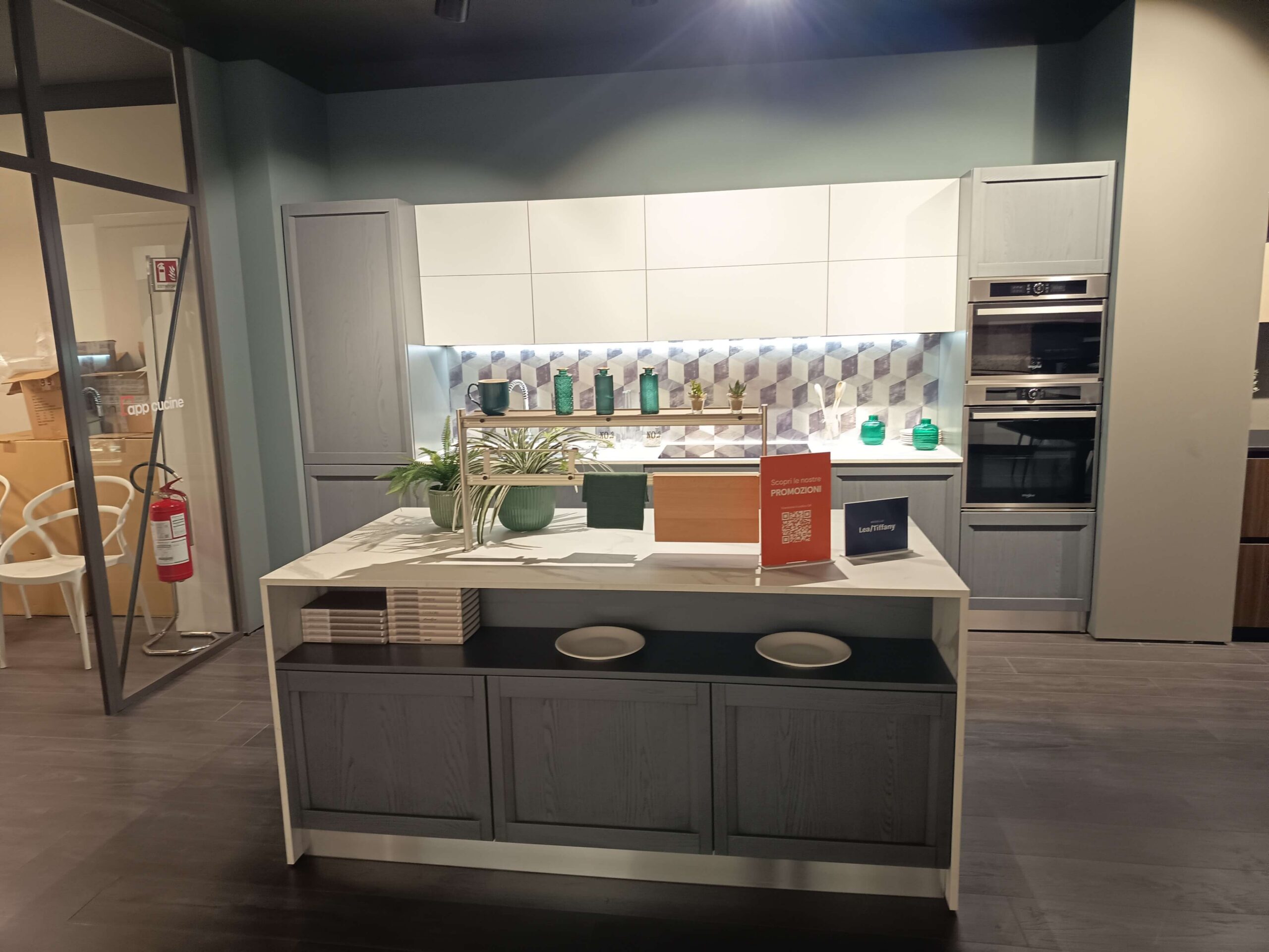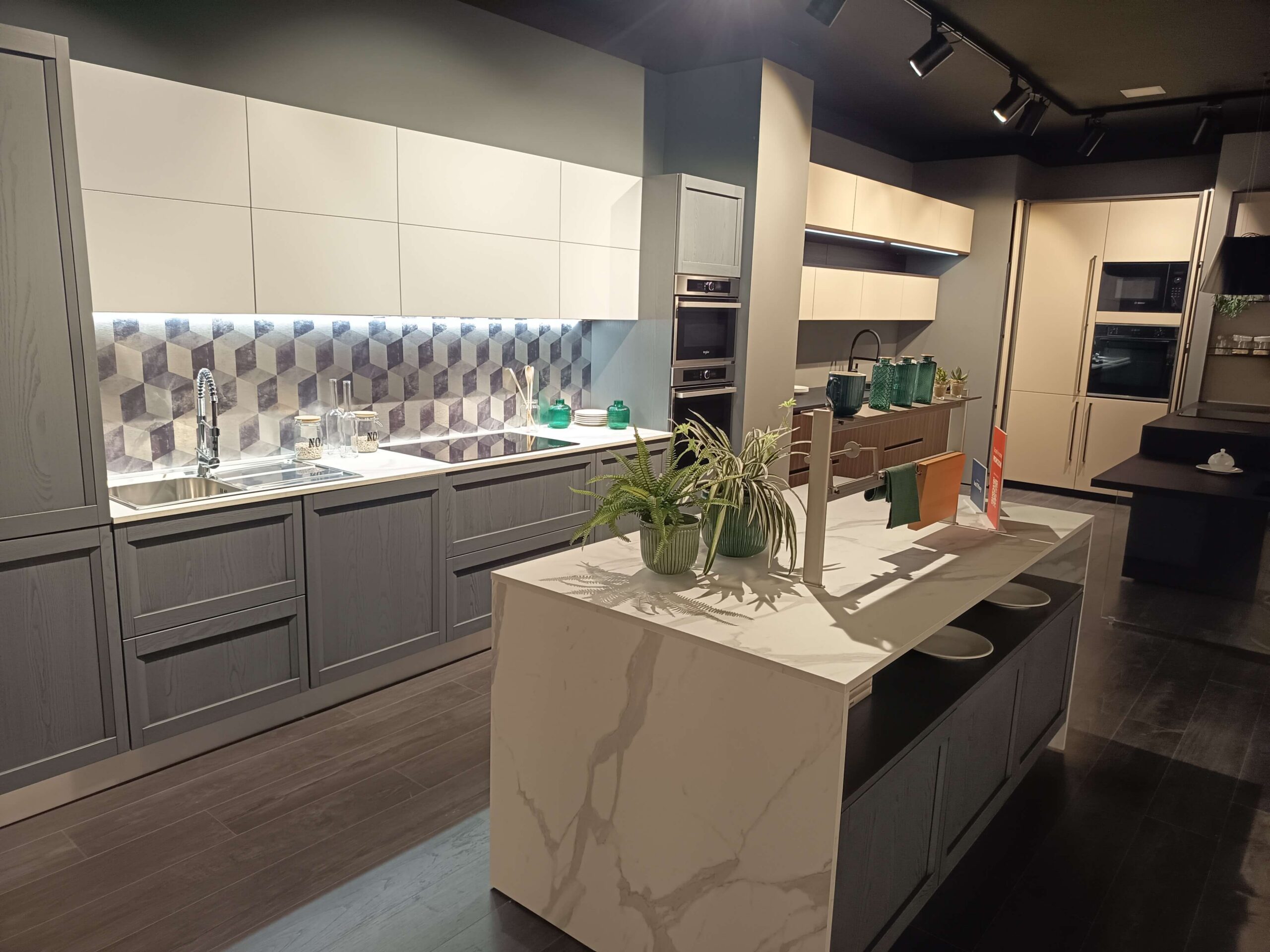 Ante e pensili: Basi e colonne ardesia, scocca antracite, pensili grigio polvere opaco. Zoccolo alluminio.